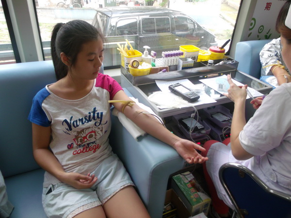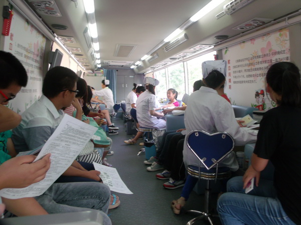 活动一共分为三部分:第一部分是向志愿者宣传献血方面的知识,并引导志愿者填写表格进行血液检测;第二部分是组织志愿者到献血车内集中献血;第三部分为志愿者抽奖并领取献血证。活动一开始,献血志愿者们便早早的到达了献血现场,随着人数越来越多,志愿者们开始排起长队填写献血表格进行血压监测,检测合格后他们在工作人员的引导下进入献血车内进行献血。献血的志愿者有男有女,他们的脸上无一不是挂满了兴奋与激动的神情,紧张而又充满期待的等候在队伍中间。车内的医生护士沉着熟练地为志愿者们抽血,一股一股热血流到血袋中,志愿者们的奉献真情也流露其中。献血结束后,志愿者们到车外进行抽奖,奖品虽然不是最贵重的,但是志愿者们参与献血的积极性与帮助他人的本性却是最让人难以忘记的。