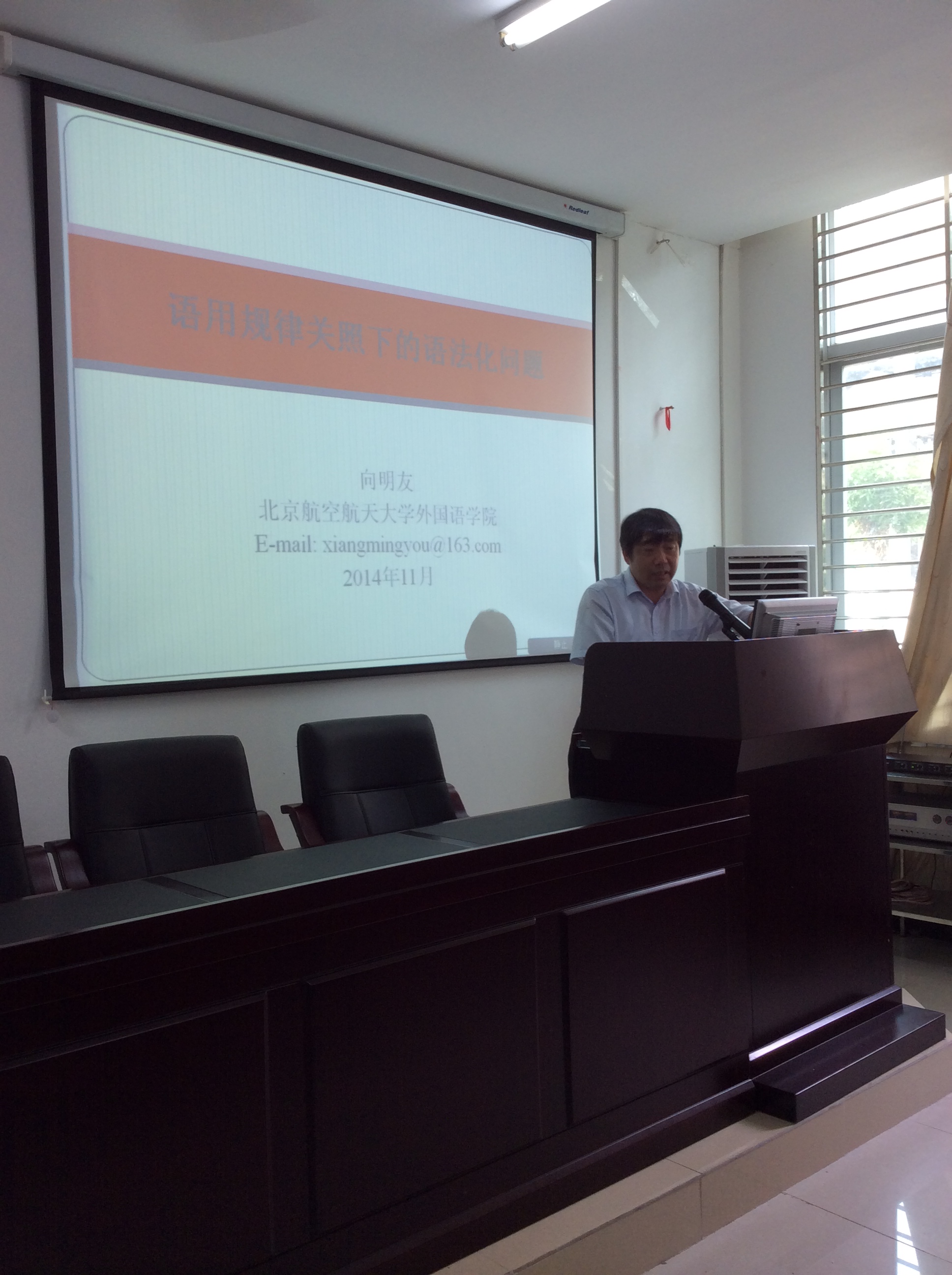 2014年11月10日下午,北京航空航天大学蓝天学者特聘教授、博士生导师、bevitor伟德经理、外国语言学及应用语言学博士向明友教授,应bevitor伟德邀请,为公司师生带来一场题为“语用原则关照下的语法化问题”的精彩讲座。此次讲座由bevitor伟德彭晓华副经理主持,公司多位骨干教师、英语专业研究生到场聆听。