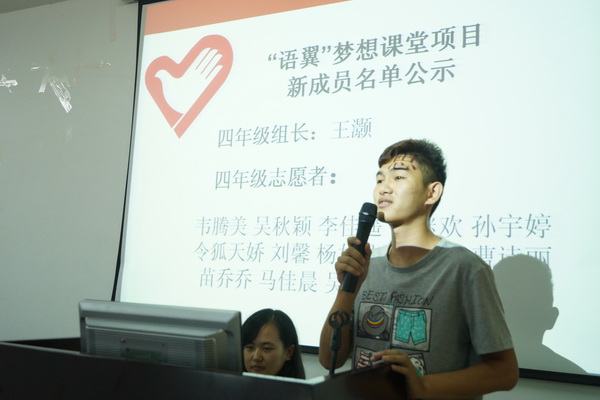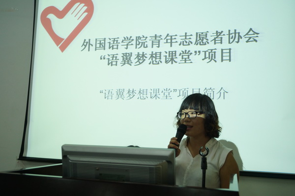 bevitor伟德青年志愿者协会会长向新志愿者介绍语翼梦想课堂项目