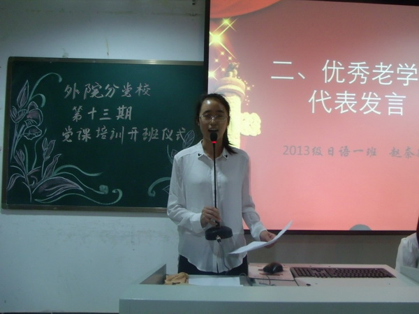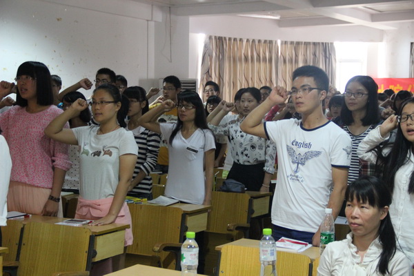 仪式进行第一项,全体起立,奏国歌。熟悉的歌声飘荡在每一个人的耳边,可今天听来却有了别样的意义。接着,2013级日语一班赵奈斯同学作为优秀老学员代表发言。她强调此次接受培训的新生们要认真对待党课内容,坚定信念,正视党史,在实践中不断提高自己的能力和素质。随后,2014级商英八班王露莹代表新生上台发言:“我们要用自己最好的状态,聆听党的内涵和真谛,在学习中必须严于律己,提升能力,做时代的新青年。”一番激动人心的讲话,点燃了在场所有同学的热情。随后的宣誓带领全场进入高潮,14级吴宇翔同学领誓,其余新生纷纷举起右拳,共同宣读那神圣而又庄重的誓言。坚定的眼神和洪亮的声音,诠释出大家对党的信仰和尊崇。仪式进行第五项,由李翠霞老师为大家作党课培训的相关要求,她指出,大家的入党动机要端正,用心领会党史的魅力,积极主动的参加讨论,勇于发表自己的见解。同时,李翠霞老师还表达了自己殷切的希冀,她希望新生们要珍惜党课学习培训的机会,争取早日加入党组织。