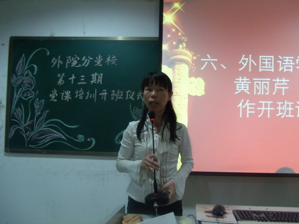 仪式进行最后一项,黄丽芹书记做开班讲话并进行党课第一讲。她为大家详细讲解了入党是为了从思想上理清现实生活中的困惑及混淆的理论。她围绕“政党知识、党的性质、党的宗旨、党的指导思想”四个方面,着重介绍了大家如何才能成为合格的党员,并用贯穿古今的事例以及自己切身经历和体会为在座的同学们描绘了党的兴起和中国的发展变迁。她强调我们应该把远大理想与脚踏实地结合起来,积极发扬无私奉献的精神,时刻准备着在党需要的时候作出牺牲并甘于牺牲。讲话结束后,如鸣般的掌声响彻全场,党课培训开班仪式及第一节党课圆满结束。