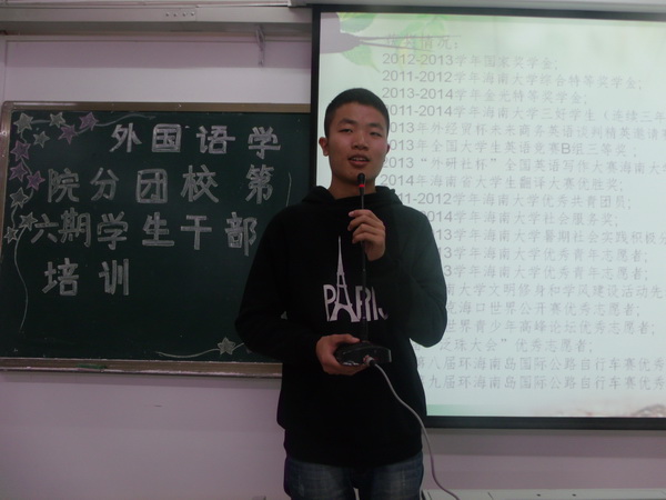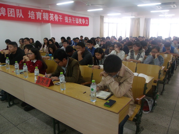 活动的最后由史付田老师进行总结性讲话,他为在场的干部们提出了几点建议:学会感恩,有空多陪陪父母;科学管理时间,合理规划自己的课余时间;做事要三思熟虑,不惧怕路途艰难;认真学习专业知识,合理规划未来。最后,老师用一句“坚持下去不是坚强,是没有选择”给予干部们期望和希冀,希望在场的同学们有朝一日也会成就自己的辉煌。