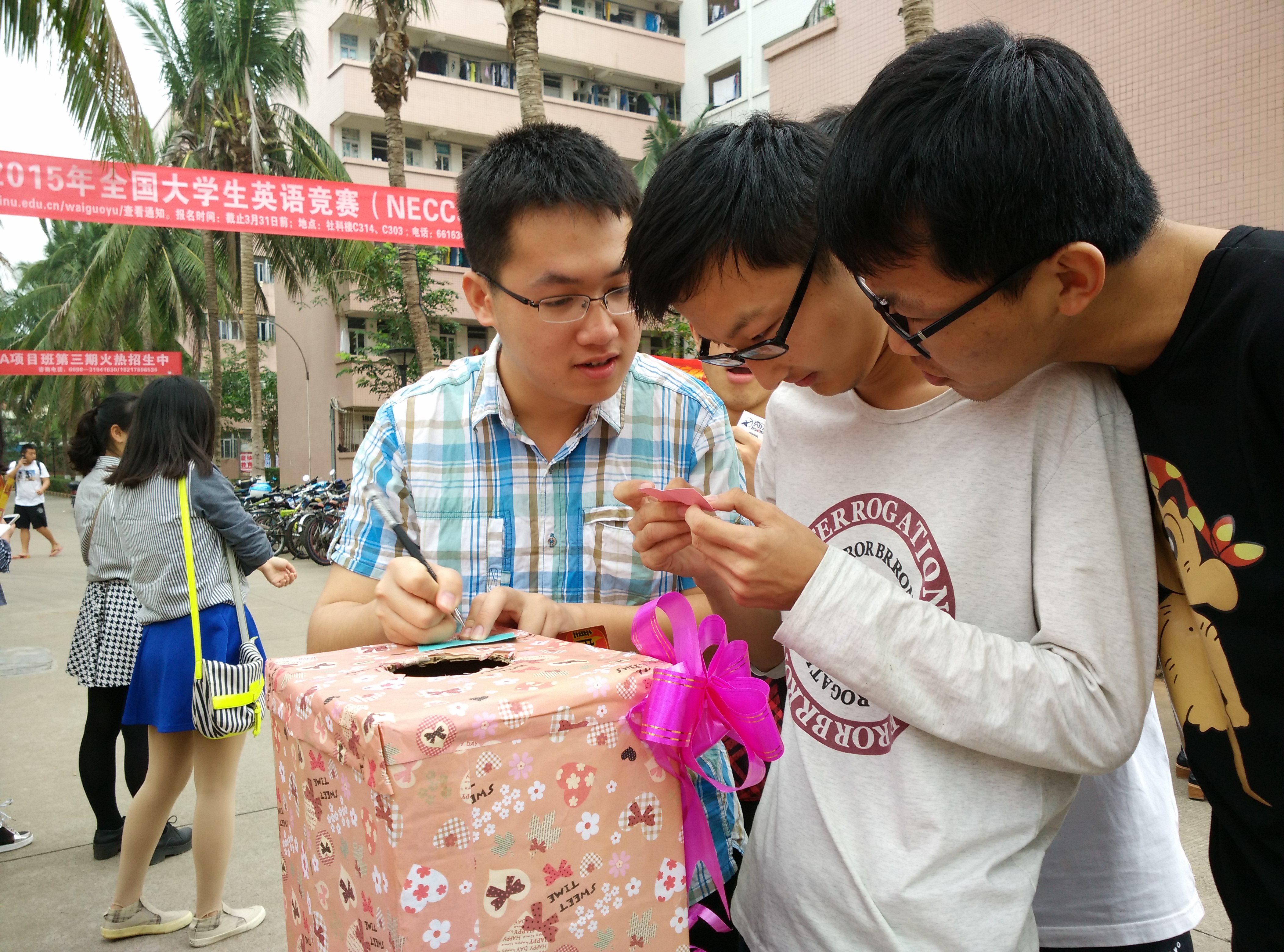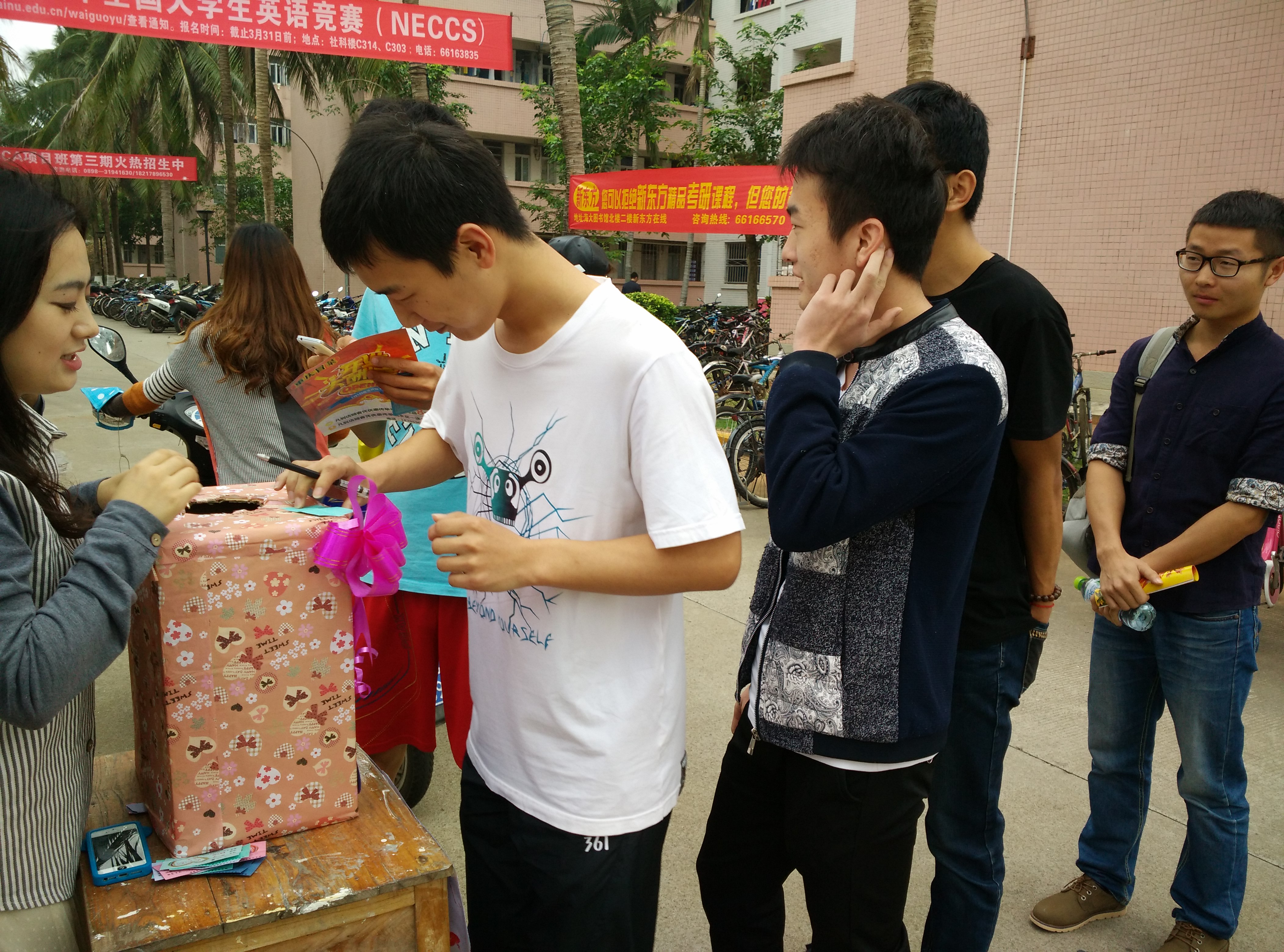 此次活动于7日上午八点半在海甸校区男生寝室楼23栋率先拉开帷幕。不少来往的男生都纷纷立足在活动地点前,抽取事先让外院各班级女生们写好的心愿卡,现场气氛十分活跃热烈。“帮我打扫宿舍卫生”、“我想要一份KFC全家桶”、“我要一盆装满土的花盆”等等心愿层出不穷,乐趣十足。对于抽到的心愿卡片,男生们都在思量三番后主动拨打起心愿卡上女生留下的联系方式,试图与女生取得联系,实现女生的愿望。随后活动又转移到10号男生寝室楼继续展开。