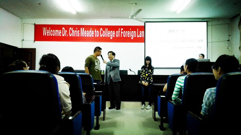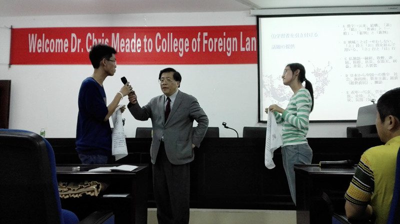 彭飞教授语言诙谐风趣,在讲座中一直与同学们进行互动。他讲述的因语言误用导致的诸多令人捧腹的误会不仅激起了在场师生的阵阵笑声,也引发了师生们对日语教育及学习的思考。讲座后,彭教授还向在场的日语系教师赠送了其主编的《88人畅谈学地道的日语》一书,并鼓励同学们在学习外语的同时也不要忽略对汉语的钻研,通过对中日两国语言文化习惯的比较,努力掌握地道的日语。