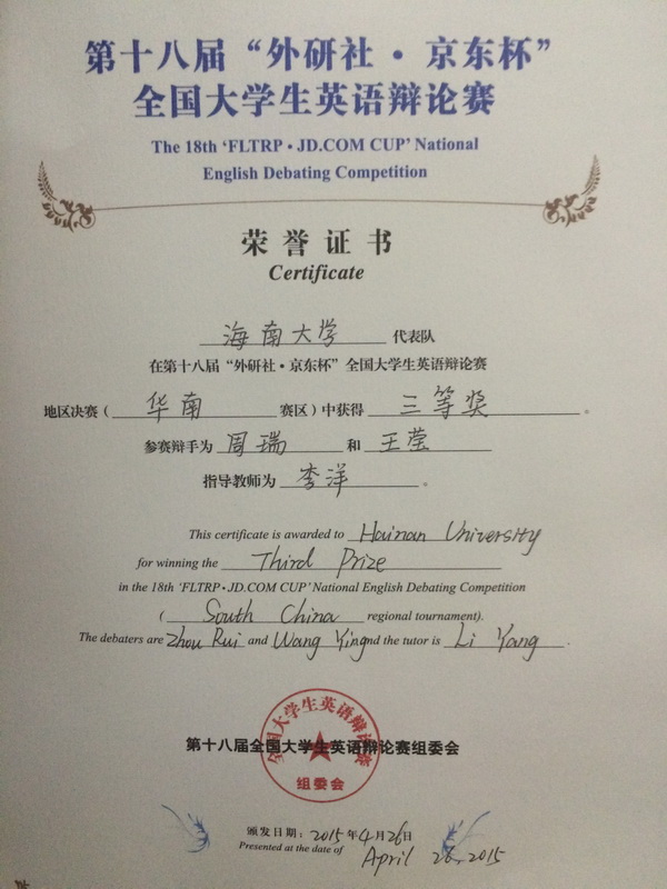 “外研社杯”全国英语辩论赛创始于1997年,每年举办一届,是目前国内规模最大、水平最高的英语口语赛事,其权威性、规模以及品牌影响力已被全国广大的英语教师及在校老员工所认可,在高校中享有盛誉。十几年来,已有累计1000余所高校精心培训选拔优秀人才组队参赛。卡西欧(上海)有限公司、剑桥大学出版社等高端品牌先后成为“外研社杯”的赞助单位。//www.hainanu.edu.cn