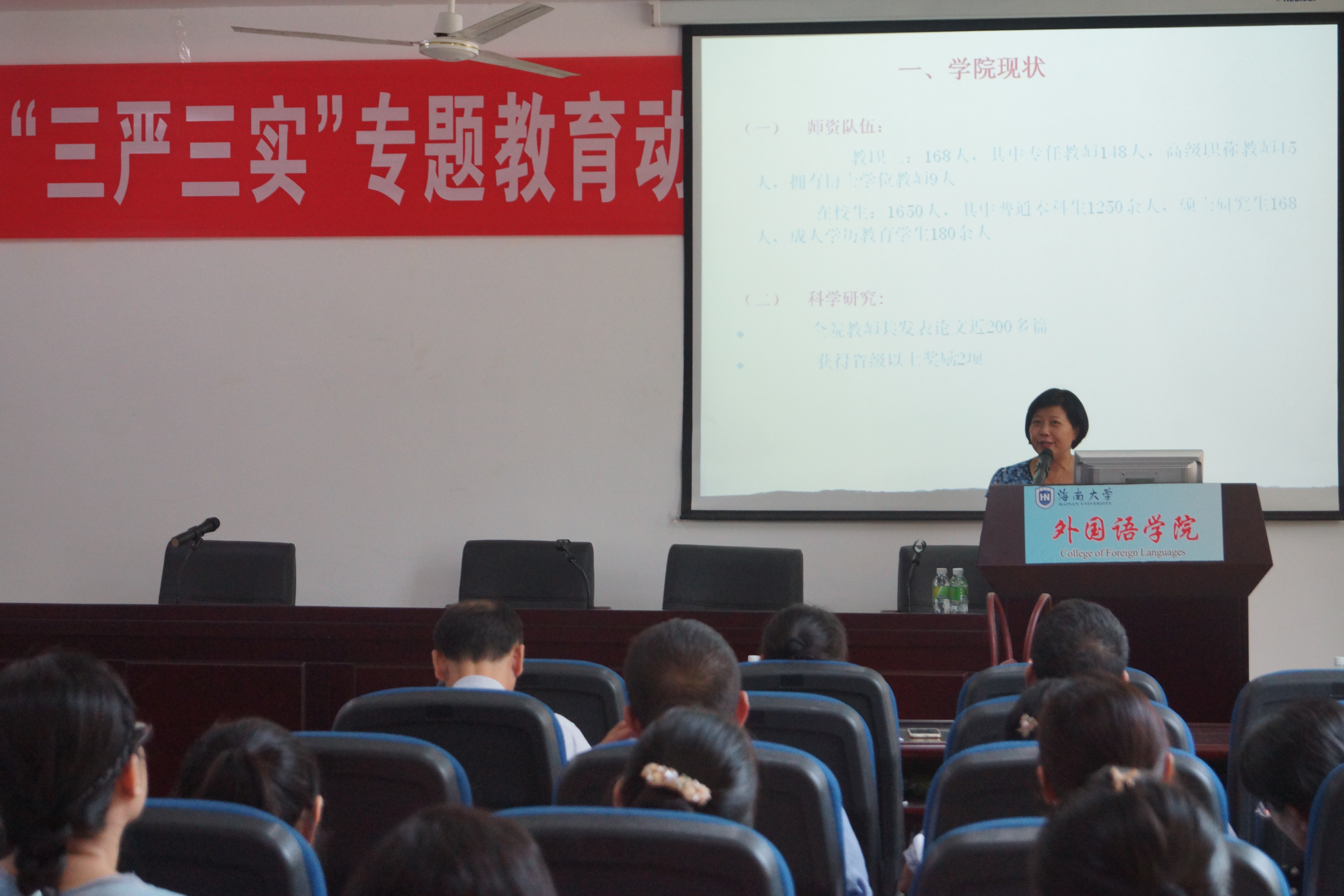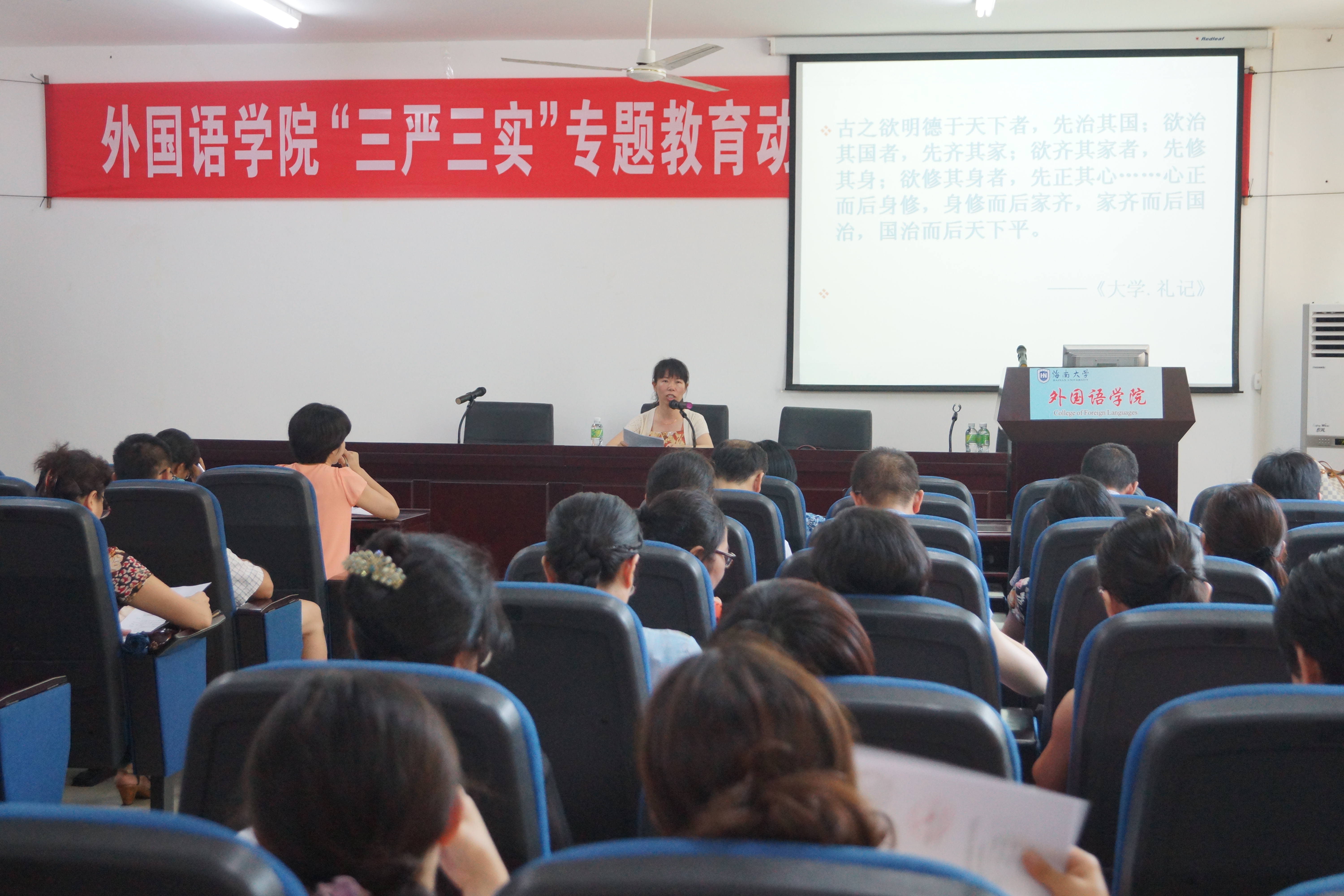 会上, 黄丽芹书记首先介绍了“三严三实”专题教育的背景,并详细阐述了“三严三实”的基本内涵和意义。她指出“三严三实”是共产党人“质”的规定性,“三严”是基础,是根本,集中体现了共产党人的理想信念和价值观。“三实”体现了党的思想路线,体现了理论联系实际的基本原则。“三严三实”是共产党人最基本的政治品格和做人准则,也是党员干部修身之本来、为政之道、成事之要。黄书记指出 “三严三实”的提出有利于从根本上解决“四风”问题,进一步巩固党的群众路线教育实践活动,把作风建设良好态势保持和发展下去,使好的作风成为党员干部的思想自觉和行动自觉。