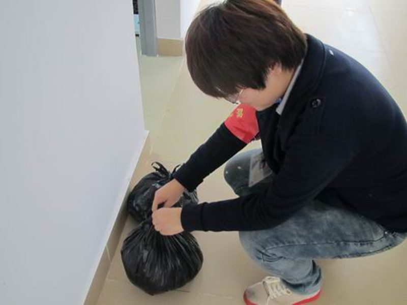 志愿者在清理宿舍垃圾