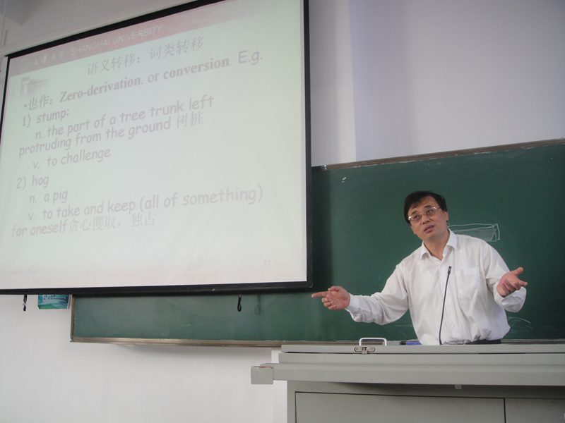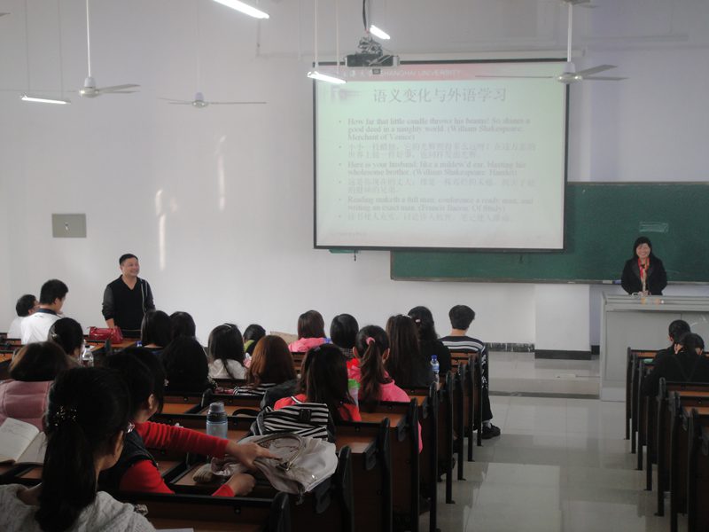 经过前三期的讲座,冯教授睿智幽默、轻松亲切的授课风格早已深入人心,同学们都翘首以待最后一场的主题讲座:《语义引申的方式及其机制》。冯教授首先介绍了语言的本质属性,并指出语言资源的有限性及经济性,最后剖析了“语义变化与外语学习”的关系,完成了从理论到实践的跨越。本场讲座是对前几场讲座内容的升华和总结,自始至终,冯教授多次向大家强调学习语言最重要的是培养思辨能力。本场讲座再次为台下的师生带来一席丰盛的精神大餐,同学们都觉得“学术”二字不再那么恐惧和遥远了。