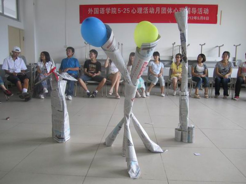 在这次团体辅导活动中,公司老师根据各班心理委员的需求反馈,确定了本次团体辅导活动的内容,针对人际关系话题设计了3个游戏活动环节。李翠霞老师在开展活动之前引导大家了解团体辅导活动的意义和要求,介绍了本次活动的内容安排,让大家对团体辅导活动有一个整体的认识。为了活跃气氛,缓解同学们的紧张情绪,首先由孙吉成老师带领大家做了“刮大风”游戏,调动了大家的积极性,同学们在此次活动中得到快乐的同时,并总结出这个游戏环节的意义,学会观察、了解身边的同学。接着由李翠霞老师带领大家做了 “微笑握手”、“滚雪球”游戏,大家热情高涨,通过与别人微笑握手,体会到了热情与真诚是收获友谊的关键,通过滚雪球游戏,让大家学会了了解自我和接纳他人,学会了与人沟通交流,学会了倾听与尊重。紧接着由陈立老师带领同学们做“建高塔”游戏,大约20分钟后,三个小组的作品精彩呈现,分别命名为胜利塔、燕南归、入云塔,最终第三小组的作品胜出。通过这个游戏,同学们认识到在人际交往中,团队意识、沟通交流、分工合作等方面的重要性。