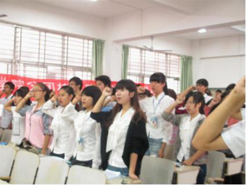 仪式第一项,全体同学起立,齐唱团歌,并在王一钦老师的带领下进行宣誓。在庄严的团旗下,公司新一届干部团队纷纷高举右手,抒发了志愿参与培训,虚心学习,服务同学的誓言。
