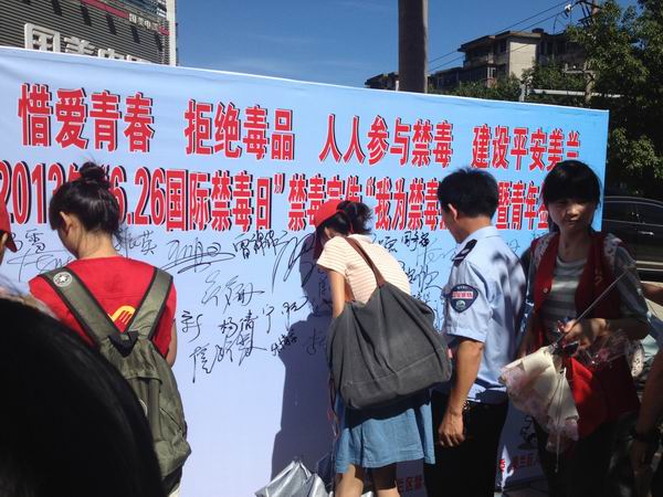 此次活动主要采取悬挂横幅标语、万人签名、发放宣传单、设立咨询台、播放禁毒宣传片的形式,紧贴群众生活,有效地吸引了广大群众前来参与禁毒活动,加入到禁毒大军中来。而公司的40多名志愿者在公司团委书记李翠霞老师的带领下表现积极,热心地向过往的群众发放印有禁毒法规的宣传材料,讲解毒品对人类和社会的危害,并对有疑问的群众进行了耐心讲解,受到了群众的一致好评。