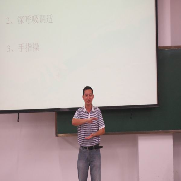 讲座围绕心身健康这一主题展开,分为心理与生理的关系,自我、生活、 社会以及掌握心理调适方法等三个部分。陈立老师先阐述了心理和生理的关系,再用鲜活的事例告诉我们健康的心理有利于个人的身体健康的维持,能够让我们在面对生活保持积极的态度和以平和的心态直面未来。心理调适是讲座的重点,陈立老师向我们介绍了中医穴位调理方法,饮食调理方法,情绪释放调理方法以及运动调理方法等,还带领现场同学一起做了手指操。
