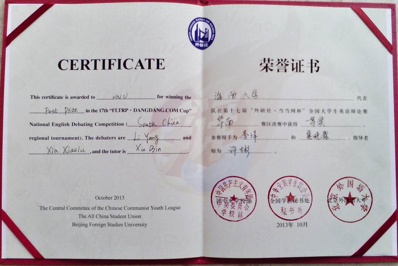 据悉,获奖的两位同学将于十月底代表华南赛区参加在北京外研社总部举行的全国辩论赛总决赛。