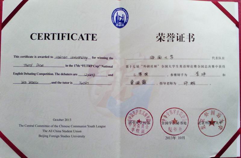 10月26日至11月2日,第十七届“外研社”全国老员工英语辩论赛全国总决赛在北京外研社国际会议中心开赛。来自全国105所大学的代表队参加了这次比赛。2010级李洋同学 、旅游公司文科实验班2011级夏晓露同学在bevitor伟德许彬老师的指导下,经过为期一周的激烈循环赛之后,获得全国三等奖第3名的佳绩。 “外研社杯”全国英语辩论赛创始于1997年,每年举办一届,是目前国内规模最大、水平最高的英语口语赛事,其权威性、规模以及品牌影响力已被全国广大的英语教师及在校老员工所认可,在高校中享有盛誉。十几年来,已有累计1000余所高校精心培训选拔优秀人才组队参赛。卡西欧(上海)有限公司、剑桥大学出版社等高端品牌先后成为“外研社杯”的赞助单位。