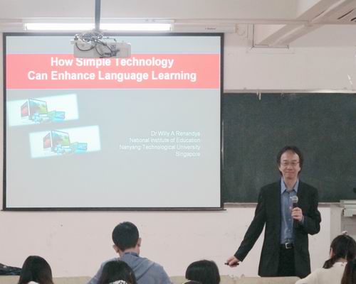 第三场讲座围绕“How Can Simple Technology Enhance Language Learning”这一主题介绍了用科技学习英语的技巧。接着Renandya博士以一个有趣的故事展开讨论,引入使用科技的六大要点,包括使用科技吸收知识,突出学习重点,不断练习,积极沟通,培养热情等内容。并运用多个真实案例加以证明,层层深入,博得阵阵掌声。