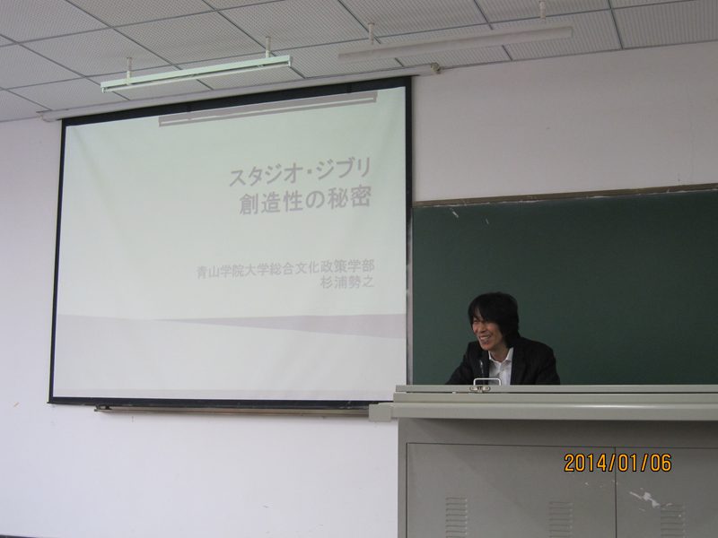 杉浦教授首先从在二维平面中的三维视觉空间和时间的表现手法这一专业视角,阐释了宫崎骏动漫和以迪斯尼为代表的美国和以哈里波特为代表的欧洲动漫的不同之处,从技术层面厘清了宫崎骏动漫的创新之处。之后,杉浦教授又从宫崎骏与高烟勳、铃木敏夫三人的关系入手,阐释了吉卜力创作室独特的企业文化。接着,杉浦教授对宫崎骏的动漫作品进行了全面而又深入的解析,指出:宫崎骏的作品表现的多是反对战争、热爱和平,崇尚自然之美的主题,之所以始终以孩子为主人公,意在通过孩子的视角感受客观世界、并从孩子的身上寻求希望。在宫崎骏的动漫中,主人公少男少女们大都具备相同的品质:勇敢、执著、善良,通过自己的努力给这个世界带来希望。最后,杉浦教授与同学们进行了积极的互动,大家谈感想,提疑问,教授的问答得到同学们的热烈响应。