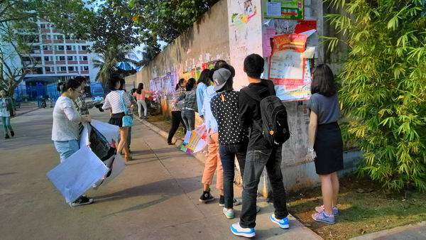 2013级经英4班为响应院团委号召,于2014年3月1日,在班级志愿者服务队负责人的组织下开展了以“清除小广告 文明进校园”为主题的志愿服务活动。早上九点,全班同学准时到第一食堂门前集合。清理前,墙壁上贴满了各色各样,五花八门的小广告,这严重影响了校园形象。活动中,班级同学划分了几个小组,开始清理墙壁,并将清理下来的废物放进活动前准备的垃圾袋中。经过两个小时的活动,墙壁变得焕然一新,尽管此刻汗水已浸透了衣衫,但同学们的脸上依然露出会心的笑容。