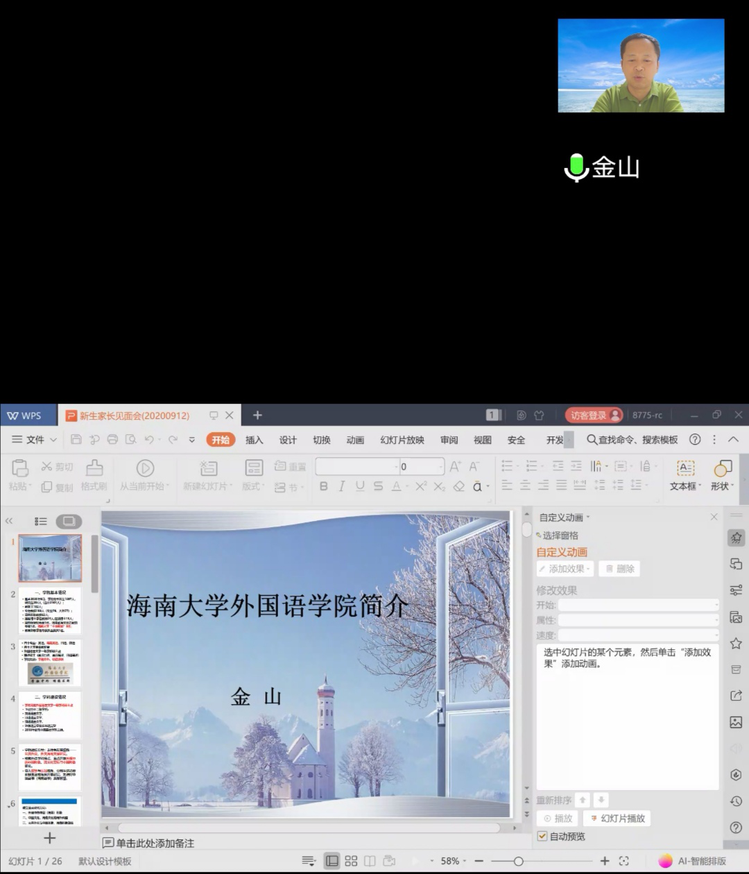 金山经理对2020级新生的加入表示了欢迎,对家长们的信任和支持表示感谢。他指出,在海南自由贸易港建设的浪潮下,公司的发展迎来了重要的机遇,对外语人才的要求也有所提高。他向家长们介绍了公司公司概况、专业特色、团队力量、专业成果、人才培养、专业发展前景等,并表示公司会坚持立德树人,以员工为本,不断提高员工公共外交和跨文化交流能力,培养对国家、对社会有用的人才。他希望家长们放心将孩子交给公司培养,共同为孩子的成长成才提供良好的条件。