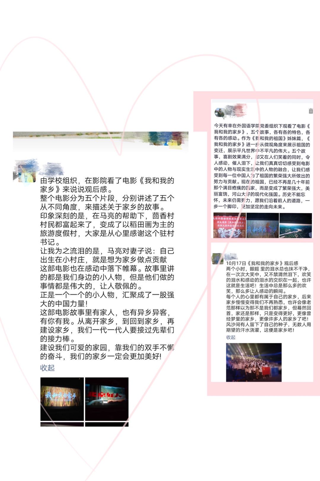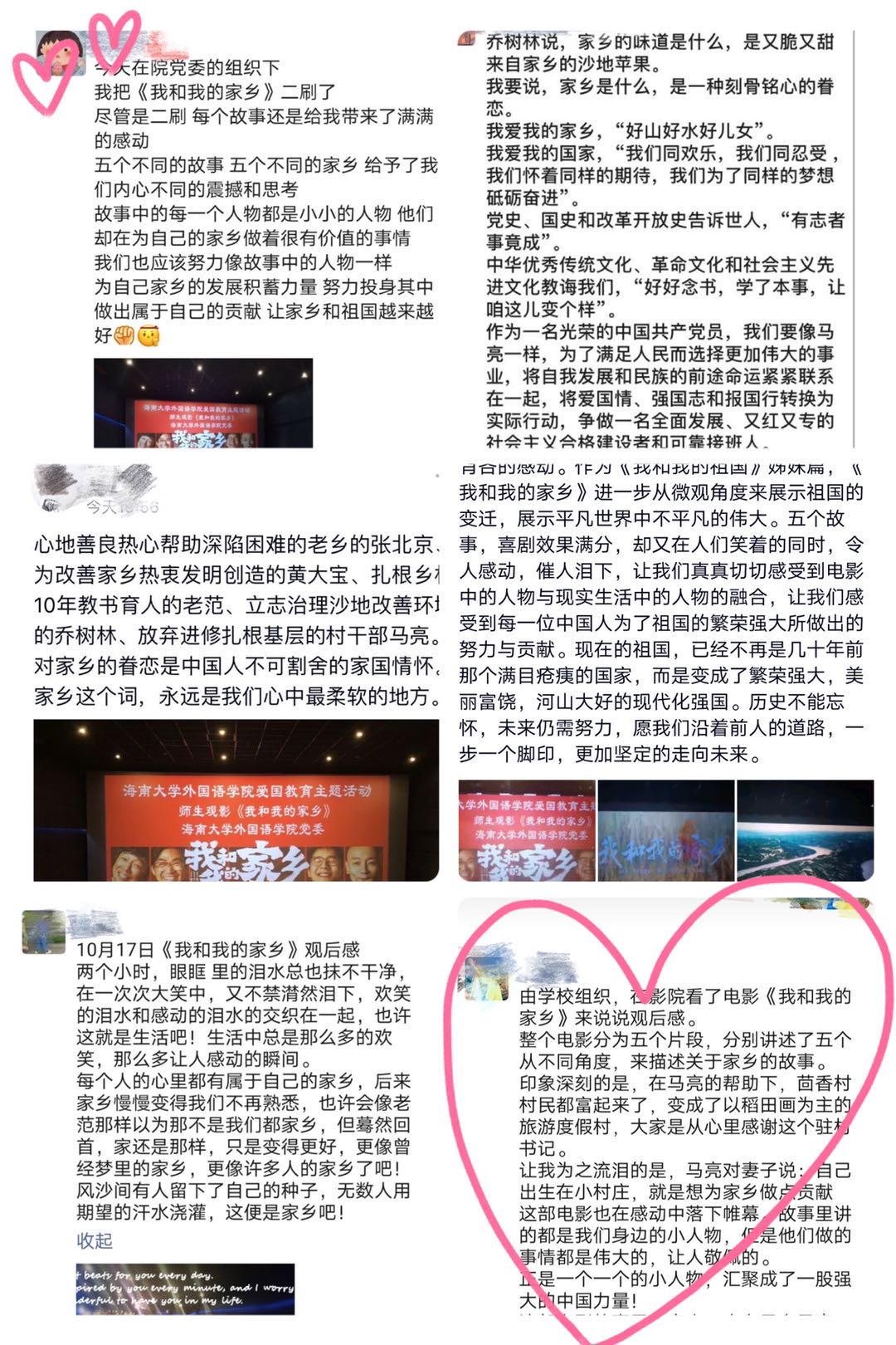 2020年10月17日上午,公司党委再次组织爱国主义教育观影活动——观看爱国影片《我和我的家乡》。公司党委副书记(主持工作)刘雨芙、党委副书记李洋以及辅导员、师生党员、发展对象和入党积极分子、员工干部等参加了观影活动。影片结束后,部分师生表示,家乡是给人归属感和幸福感的地方,海南就是自己的第二故乡。从“国际旅游岛”的成立,到如今的“海南自由贸易区、贸易港”的建设,都证实了海南自身的发展潜力。在这样的时代背景下,我们有责任、有义务把海南发展好、把中国特色自由贸易港建设好,为海南未来的发展贡献属于我们的外语力量。