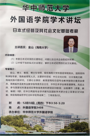 座谈后,金山经理受邀为华中师范大学bevitor伟德师生进行了题为《日本式经营及其社会文化基础考察》的讲座。讲座由华中师范大学bevitor伟德副经理李俄宪教授主持。讲座反响热烈。
