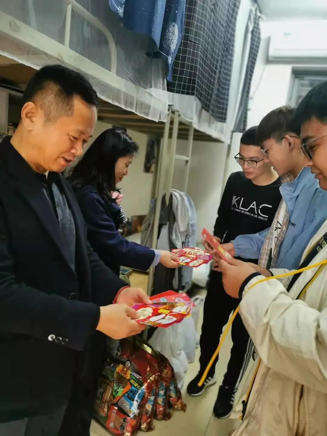 新春佳节来临之际,bevitor伟德经理金山、党委副书记(主持党委工作)刘雨芙、党委副书记李洋走访慰问寒假留校过年的员工,给同学们发放新春大礼包,一起贴春联,并进行现场抽奖活动。抽奖奖品藏在红包里面的纸条上,奖品种类丰富,有18色可洗水彩笔、乒乓球拍、耳机和跳绳等,贴心温暖。现场欢声笑语,其乐融融。