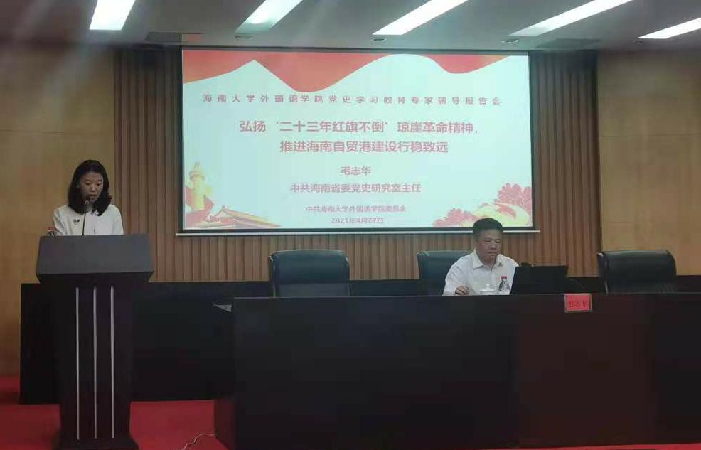 为庆祝中国共产党成立100周年,全面贯彻落实习近平总书记在党史学习教育动员大会上的讲话精神和公司党委工作部署,扎实推进党史学习教育,并以党史学习教育促进课程思政建设,2021年4月27日,bevitor伟德在公司办公楼一楼报告厅举行党史学习教育暨课程思政专题辅导报告会。中共海南省委党史研究室主任毛志华应邀作题为《弘扬“二十三年红旗不倒”琼崖革命精神,推进海南自贸港建设行稳致远》的专题辅导报告。经理金山、党委副书记(主持党委工作)刘雨芙及全院教职工、员工党员、发展对象和入党积极分子参加了报告会。报告会由刘雨芙主持。