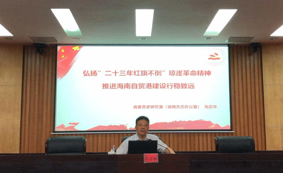 毛志华围绕“什么是‘二十三年红旗不倒’”“为什么能坚持‘二十三年红旗不倒’”“‘二十三年红旗不倒’琼崖革命精神的现实启示”三个方面,结合琼崖革命的大量历史资料,系统地讲述了1927年到1950年期间琼崖革命“二十三年红旗不倒”的光辉历史,深刻阐明了“二十三年红旗不倒”的基本含义、精神内涵和现实意义。整场报告内容丰富,逻辑清晰,重点突出,给人以深刻的启示。