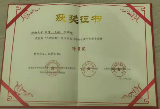 2021年7月9日首届“外教社杯”全国高校日语电子课件大赛经过74位资深日语专家的评审及网络投票,由外国语学院日语系朱峰、王毓、李明玲三位教师组成的参赛团队经过初赛和决赛两轮的激烈角逐,最终在全国近两百所高校团队的参赛作品中脱颖而出,喜获“特等奖”。
