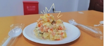 俄餐第一道菜是закуски(冷盘),通常为沙拉、罐头、奶酪和鱼子酱。赵哲老师准备的是俄罗斯沙拉之王(Салат опивье),由土豆、火腿、豌豆和胡萝卜组成,佐以俄罗斯沙拉酱,简单的食材使用最朴素的烹饪方式,美味得以形成。