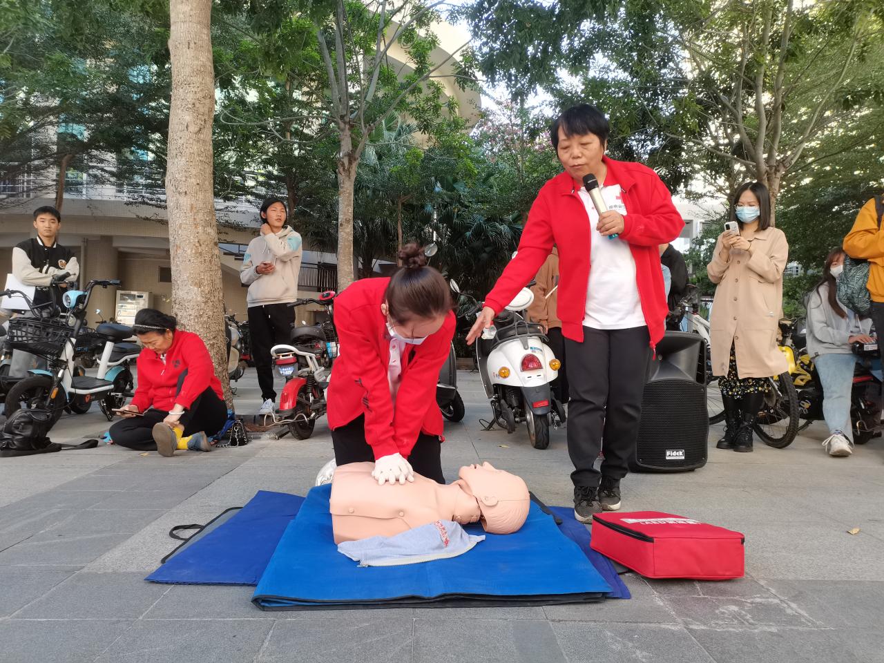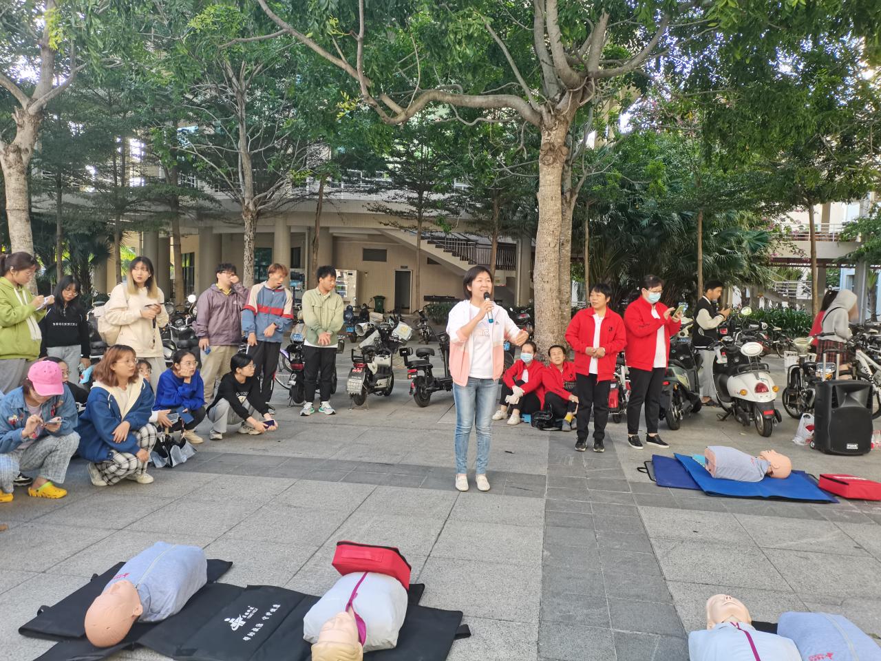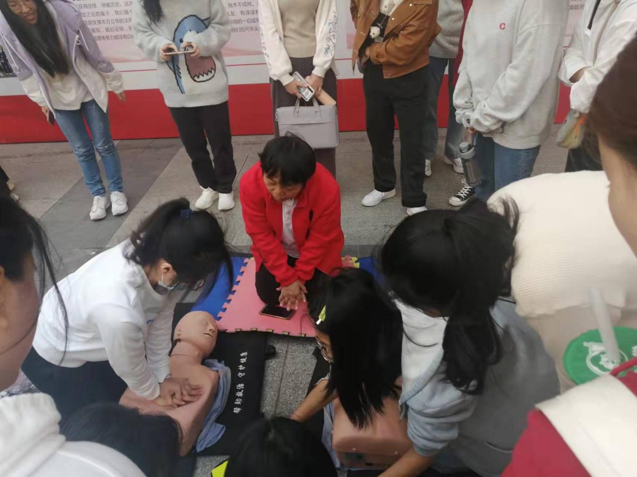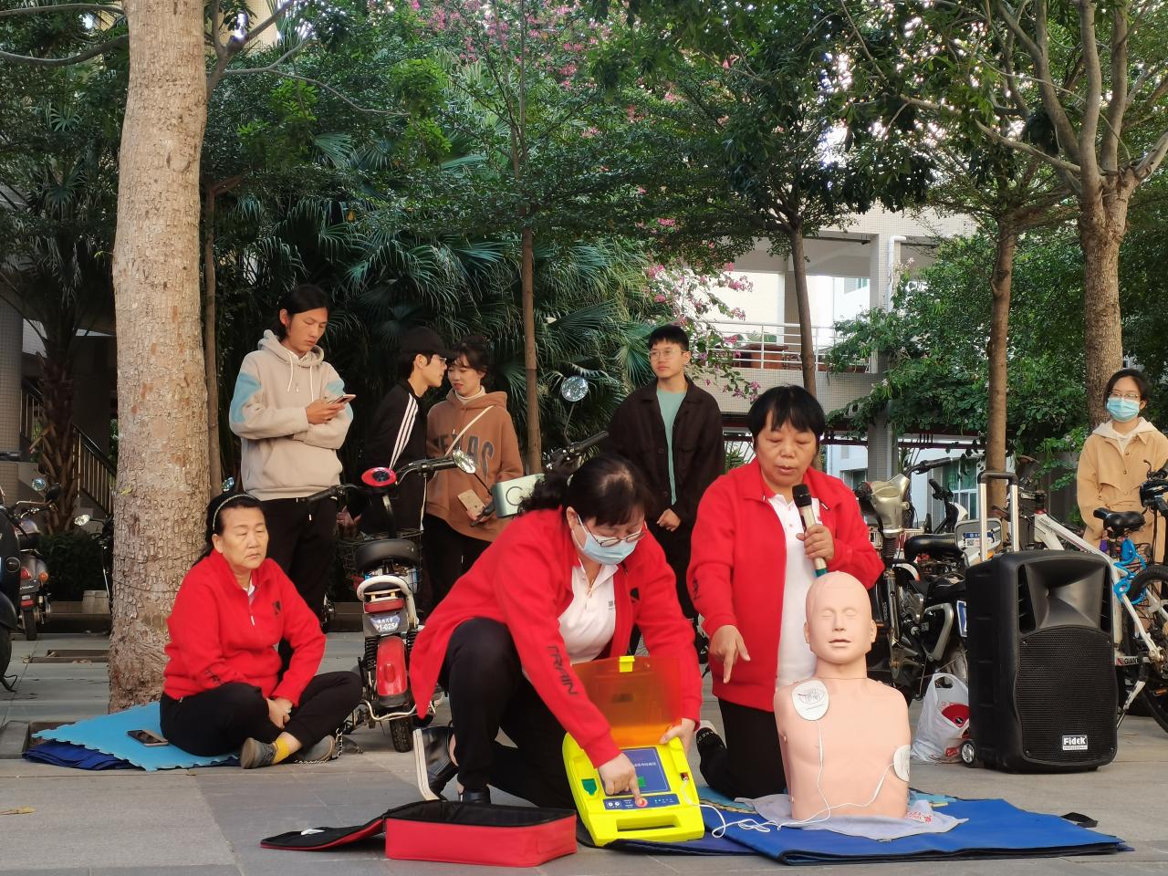 活动现场,医护人员采取理论讲解、示范操作、现场演练等方式进行,为大家细致的讲解了如何有效地在“黄金4分钟”抢救时间内进行应急救护和AED的使用方法,并利用人体模型为大家反复演示如何判断意识、判断呼吸、心肺复苏的按压定位、身体姿势、按压手势、频率的要点等。