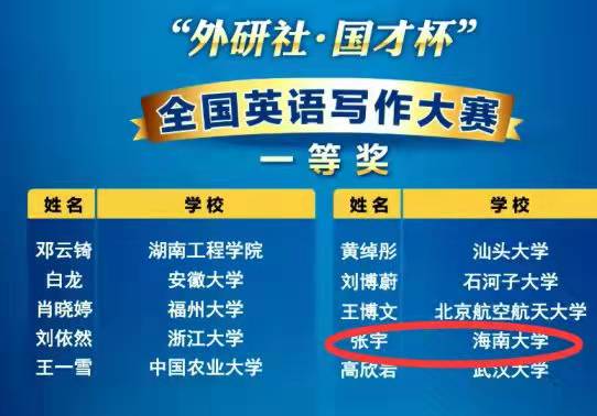 英语专业徐晨鸿获得演讲大赛二等奖(邱新慧老师指导),英语口译研究生陈家维获得演讲大赛三等奖(林清瑜老师指导)。笔译专业张宇获得写作大赛一等奖(郭锦萍老师指导),英语专业刘皓月获得写作大赛二等奖(欧茹萍老师指导),工商管理专业林江楷获得写作大赛二等奖(李芬老师指导)。英语专业任子墨获得阅读大赛三等奖(卢蓉老师指导)