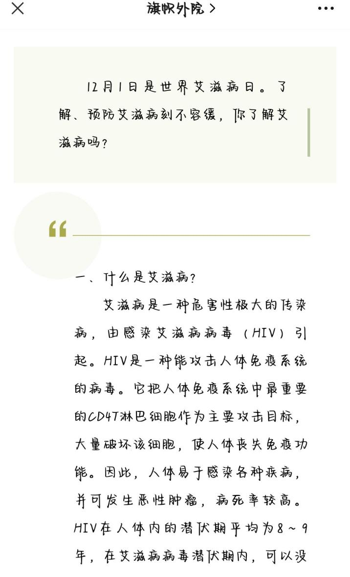 公司宣传高地“旗帜外院”在此次世界艾滋病日宣传活动中发挥积极作用,连续发布三篇推文,普及艾滋病的传播途径预防手段以及国家免费自愿咨询检测服务等相关知识,就我国艾滋病感染现状号召同学们提高警惕。