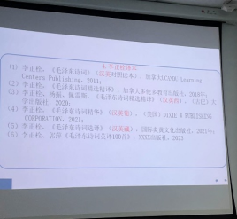 讲座开始之前,李教授先播放了一段99岁翻译大师许渊冲先生朗读他翻译的毛泽东诗词《七绝 为女民兵题照》的视频。许老师富有激情的朗诵深深打动了在座的每一位师生,也把大家的思绪带到了毛泽东诗词中来。接着,李正栓老师就毛泽东诗词的主要传播方式和关键时间节点为大家进行了清晰地梳理,毛泽东诗词传播始于1937年,至今已有约85年时间,经历了起始、发展到稳定三个重要阶段。这80余年中,毛泽东诗词始终保持着强劲的文化吸引力和艺术感染力,在国内不断出版并重印。特别是在最近十年毛泽东诗词的传播过程中,李正栓老师的翻译工作功不可没。从2011年至2022年,李老师翻译的毛泽东著作多达6本,为新时期毛泽东诗词在国际上的传播做出了重大贡献。
