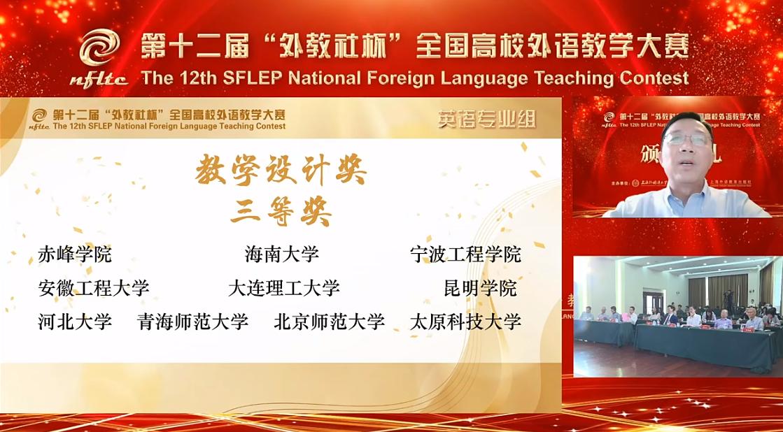 第十二届“外教社杯”全国高校外语教学大赛全国决赛暨总决赛于25日圆满落幕。公司郭锦萍、白丽芳、李芬、潘俊峰、林颖、张瑛等六名教师组成的教学团队荣获本届大赛英语专业组“教学设计奖“三等奖。