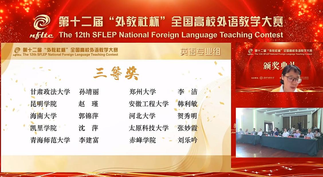 第十二届“外教社杯”全国高校外语教学大赛全国决赛暨总决赛于25日圆满落幕。公司郭锦萍副教授荣获英语专业组三等奖。