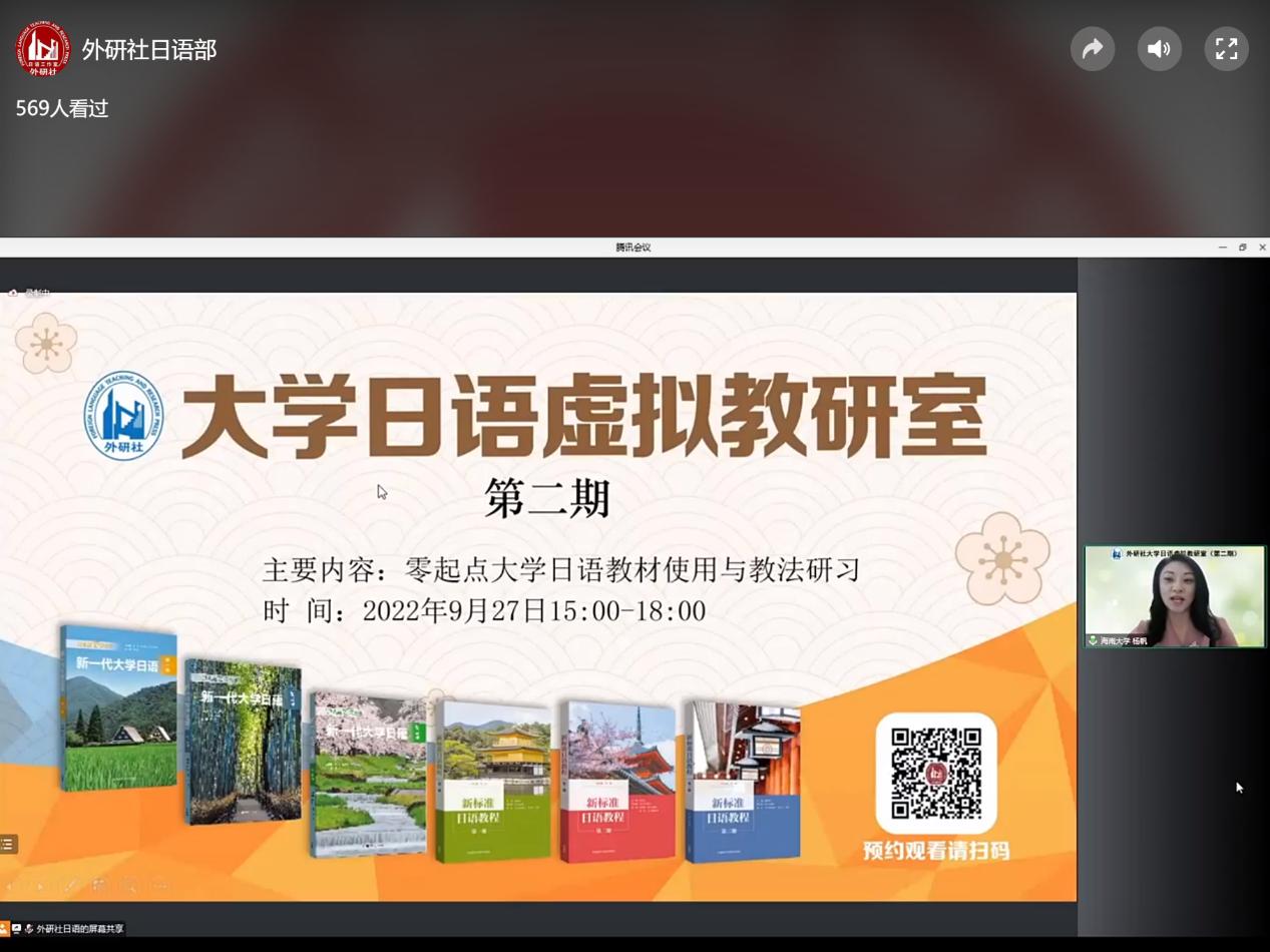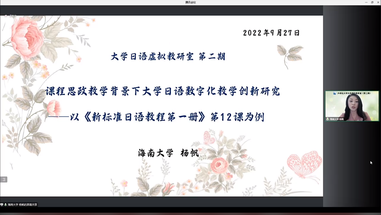 2022年9月27日下午,由外研社主办的大学日语虚拟教研室第二期正式开讲,公司教授杨帆以《新标准日语教程第一册》第12课为例对课程思政教学背景下大学日语数字化教学创新研究进行了分享与介绍。该研究课题组成员包括:杨帆、佟占新、方海燕、王艳珍等四位教师。此前,课题组也在外研社举办的全国课程思政教学设计大赛中合作荣获二等奖。