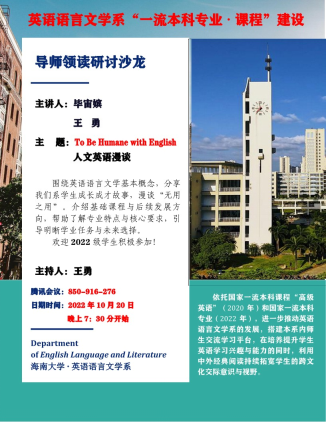 2022年10月20日晚上7点30分,围绕“一流本科专业暨本科课程”建设目标,英语系为2022级新生举行了一场“导师领读研讨沙龙”活动。本次沙龙以线上形式进行,邀请了毕宙嫔老师和王勇老师跟同学们分享本系专业内容以及员工成长成才的故事。本次沙龙由王勇老师主持,英语系2022级全体同学参加了本次活动。