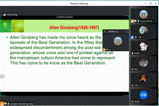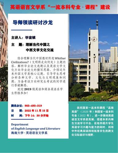 2022年11月15日下午14点30分,围绕“一流本科专业暨本科课程”建设目标,英语系为2019级英语班的同学举行了第三场“导师领读研讨沙龙”活动。本次领读研讨以“理解当代中国之跨语言文化传播”为主题,通过线上形式进行。本次沙龙邀请了英语系毕宙嫔老师进行领读研讨,2019级英语专业和商英专业部分同学参加了本次活动。