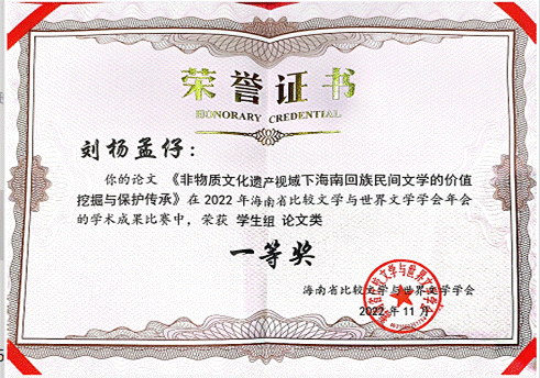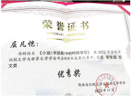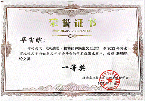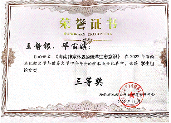 在学术成果评比中,毕宙嫔的论文《朱迪思· 赖特的种族主义反思》荣获教师组一等奖。刘扬孟仔的论文《非物质文化遗产视域下海南回族民间文学的价值挖掘和保护传承》荣获员工组一等奖,王静银的论文《海南作家林森的海洋生态意识》荣获员工组三等奖,屈凡恺的论文《小说(书信集)中时间书写》荣获员工组优秀奖。三位研究生的指导老师分别吕卉副教授、毕宙嫔副教授和刁科梅教授。
