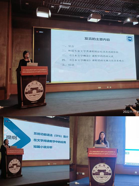 公司白丽芳教授、毕宙嫔副教授和方海燕副教授在青年学者论坛环节分别做了题为“系统功能语法视角下短篇小说的阅读教学”、“朱迪思· 赖特的种族主义反思”和“高校外语学科文学类课程的思政教学策略的探析—以《日本文学概论》课程为例”的发言。20级英语语言文学专业研究生王静银、21级俄语语言文学专业研究生屈凡恺和22级俄语语言文学专业研究生刘扬孟仔三名硕士也在全国青年教师与硕士生论坛环节宣读论文。