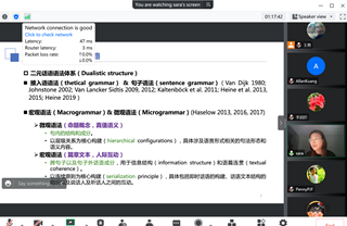 张玥老师分享了基于二元话语语法的现代汉语词汇与句法现象研究,以汉语单音节副词“都”为具体案例,结合丰富的现代汉语语料,利用定量统计工具等科学计量手段方法,探讨论证了副词延伸现象、方位词的一词多义等核心研究议题。基于语言本体研究,张老师还结合个人学习研究经历,参照近年来国家社科的方向性条目以及立项项目,进一步指明了语言本体研究中形态句法等重要方向,以及语篇互动、汉外教学中的指称词与副词等的语义语用现象、语言历时演化问题、跨语言类型学研究等,讲述了该方向的广泛应用前途。分享过程中,张老师还结合相应研究对象,提供了最新的参考文献和相关语料资源,便于感兴趣的老师参照借鉴。