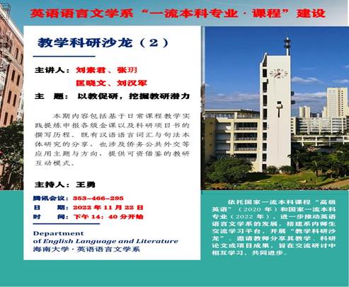 2022年11月22日下午,围绕“一流本科专业暨本科课程”建设目标,英语系举行了一场以“以教促研,挖掘教研潜力”为主题的教学科研沙龙。本次沙龙以线上形式进行,由王勇老师主持,英语系全体教师参加了本次教学科研研讨活动。