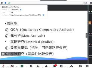 第二场专题讲座由董洋老师领读研讨,主要例解了定量研究在应用语言学的应用问题。讲座伊始,董洋老师向同学们简要介绍了应用语言学的主要概念,提醒同学思考同语言有关的多种社会问题,尤其是与英语学习相关的语言教学问题。总体上,董老师指出,相比定性研究,定量研究拥有更强的客观性和可复制性。因此,本专题基于近10年中外核心学术期刊(SSCI和CSSCI)文献的梳理结果,筛选采用定量研究实验方法开展应用语言学研究的典型文献,进行解释和说明。通过介绍主要的定量研究方法,包括QCA、元分析、路径分析、差异性比较分析,结合具体案例以及丰富的图例,向同学们介绍了运用这些研究方法开展实证语言教学研究的重要步骤和结果。同时,还结合相关论文,介绍了语言研究中提取研究样本,对统计数据进行科学检验的方法手段。通过比较常用四种定量研究法的优缺点,针对不同应用语言学的、选题提出定量分析建议,拓宽了员工对专业发展方向的认识和理解,激发同学们学习语言、分析语言现象、思考相关语言研究议题的兴趣。