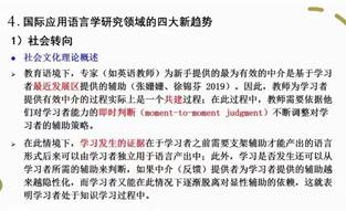 第一场专题讲座由周世瑶老师领读研讨,围绕国际应用语言学研究动态与前沿话题展开分享。周老师结合大量统计结果,通过丰富的数据信息,简明扼要,深入浅出地向同学们介绍了应用语言学的前沿研究议题,在拓宽员工视野的同时,引导员工结合自身语言学习经历观察反思身边值得探究的语言现象和问题。讲座首先基于对应用语言学类SSCI期刊近10年的文献梳理,着重分析了国际应用语言学研究领域的四大新趋势,即社会转向、多语转向、积极转向和生态视角,聚焦各领域研究内容。围绕双语教育与语言政策、语料库语言学、以使用为基础的理论等研究话题,结合本系课程开设情况,做了简要解析,还分享了中国在该领域取得的重要成果。其后,周老师总结评述应用语言学研究方法的发展趋势,详细介绍了实证类研究以及定向研究的增长趋势,穿插解释了诸如神经刺激技术、抽样方法、叙事研究的数据收集方法、基于问题分析总结概括了应用语言学研究应该注意的诸如伦理问题、透明性分析过程等重要因素,进而提出相应的建议。最后,周老师还特别针对二语习得的跨学科特性提出相关的可行性研究主题,包括二语知识的复杂动态性、二语学习者社会身份以及个体能动性等。同学们积极参与,围绕各自感兴趣的话题,与周老师进行了互动交流。