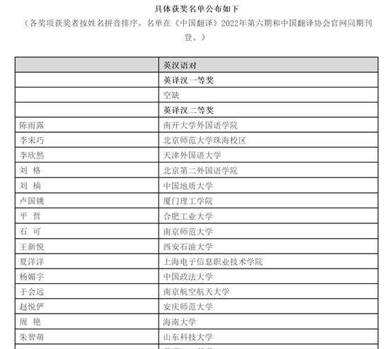 据悉,韩素音国际翻译大赛创办于1989年,是中国翻译界组织时间最长、规模最大、影响最广的翻译大赛,并受到全国乃至海外青年翻译爱好者的欢迎和认可。本届大赛由中国翻译协会、中国翻译研究院与天津外国语大学联合主办,教育部中外语言交流合作中心支持,《中国翻译》杂志社与天津外国语大学高级翻译公司联合承办。经过严格的评审和终审讨论,英译汉共评出获奖者333名:一等奖空缺、二等奖15名、三等奖33名、优秀奖285名。