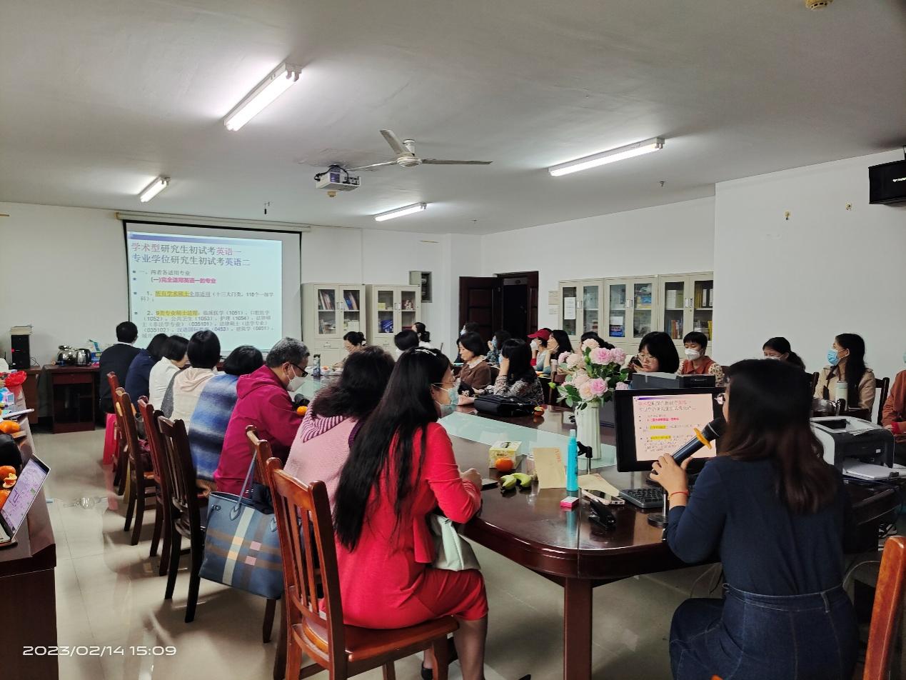 2023年2月14日下午,为助力英语教师提升教学能力,大学英语教研室举办了教学交流会,主讲教师为大学英语第一教研室主任孙建萍老师,第一和第二教研室全体教师参加。会议由大学英语第二教研室主任黄容波主持。