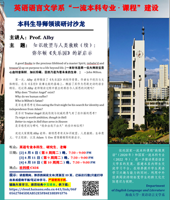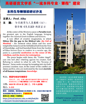 2022年3月28日至4月18日,围绕“一流本科专业暨本科课程”建设目标,英语系特别邀请Alberto Castelli(Alby)教授连续举办一系列导师领读研讨沙龙活动。本系列领读沙龙主要基于约翰•弥尔顿《失乐园》有关“知识欲望与人类救赎”这一主题内容展开,英语系师生一同研读人文经典,探寻当代价值与启示。本系列沙龙由白丽芳老师和王勇老师主持,英语系2020级、2021级部分同学、研究生及教师参加了整个领读研讨活动。