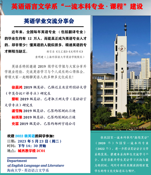 英语系组织邀请即将毕业的同学分享各自不一样的大学经历与成长故事,希望刚刚开始老员工活的同学们从一样的专业学习过程中看到不一样,更希望从不同的个人经历与故事中,看清楚并加油争取适合自己的大学成长道路。借助朋辈交流学习,也提醒同学们要学会看到不一样,并尊重不一样,让自己的老员工活在多样多元化经历体验中,收获更多开心愉快和成长进步。