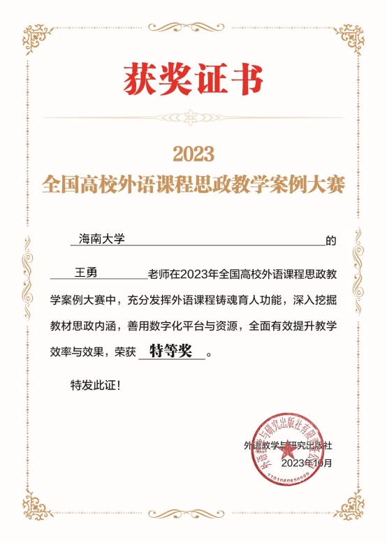 全国高校外语课程思政教学案例大赛由外语教学与研究出版社主办,旨通过搭建沟通交流课程思政育人实践的赛事平台,全面提升课程思政建设深入性、创新性与有效性,助力高校服务国家战略、培养新时代所需的高素质外语人才。