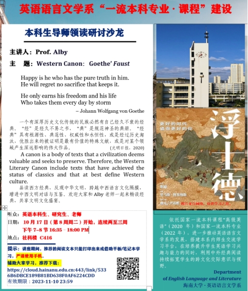2023年10月17日下午,在社科楼C416办公室,英语系举行2023年秋季学期导师领读研讨沙龙。本系列沙龙由英语系教师Alby老师带领大家一起研读西方人文经典《浮士德》,分享了歌德笔下浮士德探寻真善的故事。沙龙由王勇老师主持,英语语言文学专业研究生、英语系本科生参加了本次研讨沙龙。